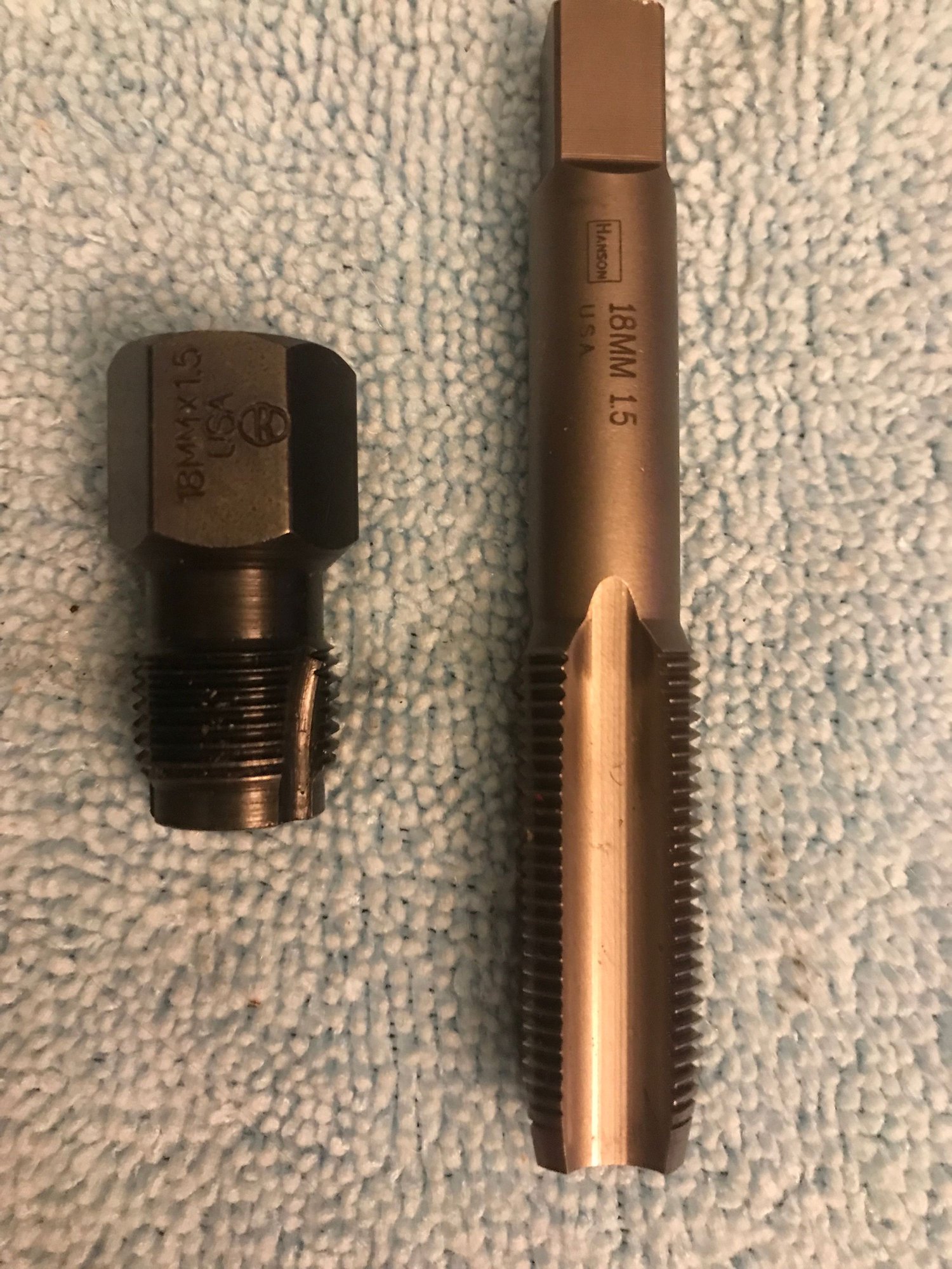 It worked nicely using the proper tap. The short tap on the left is a Lisle branded part which was not able to get a purchase on the galled threads. It cost $8. The tap on the right with the longer more gradual taper was able to work its way down in to the hole to clear the galling and restore the original threads.