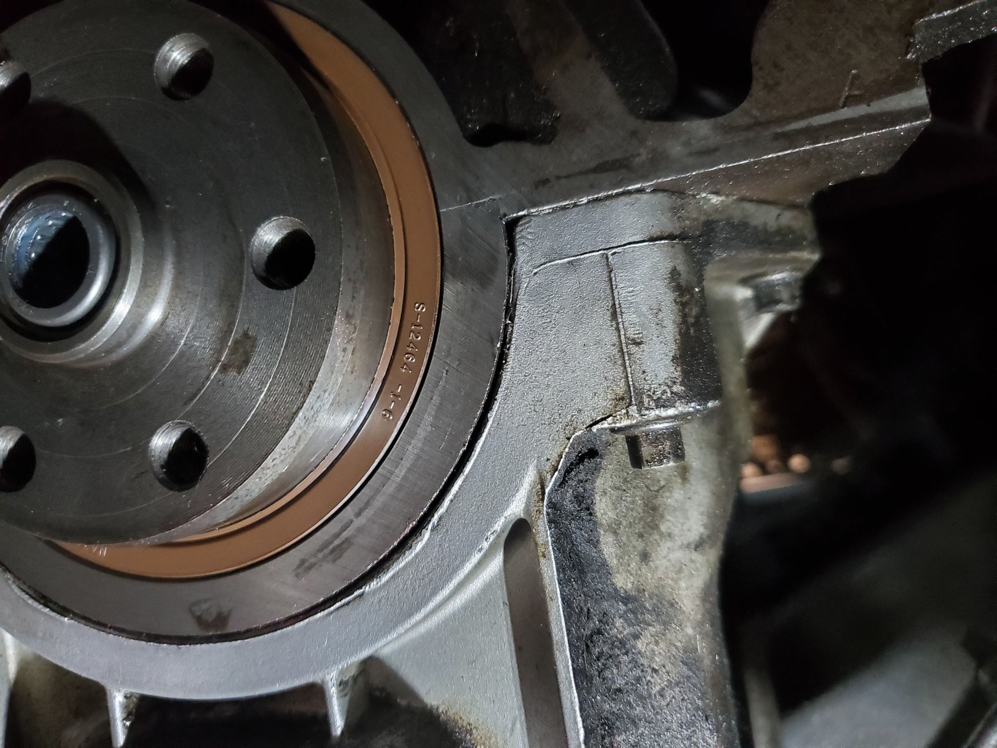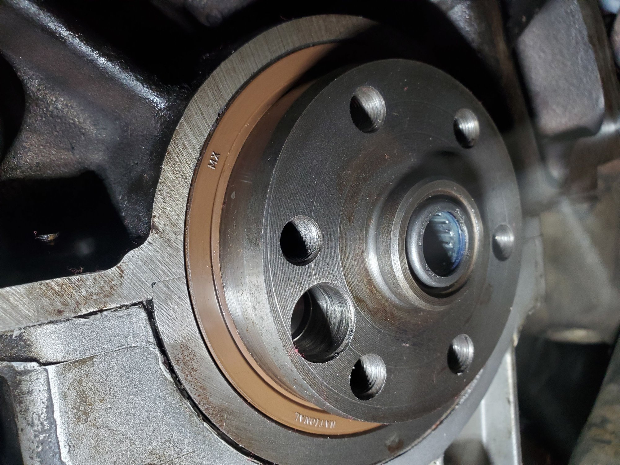 I installed the new pilot bearing and rear main seal. Hopefully I did it right, photos attached. I rubbed 5w-30 oil on the inside of the seal. I'm hoping that helped it slide over the crankshaft without the lips folding over (This seal did not come with the plastic install tool). I can't see what happened on the inside, but it felt like it slid on smoothly enough.