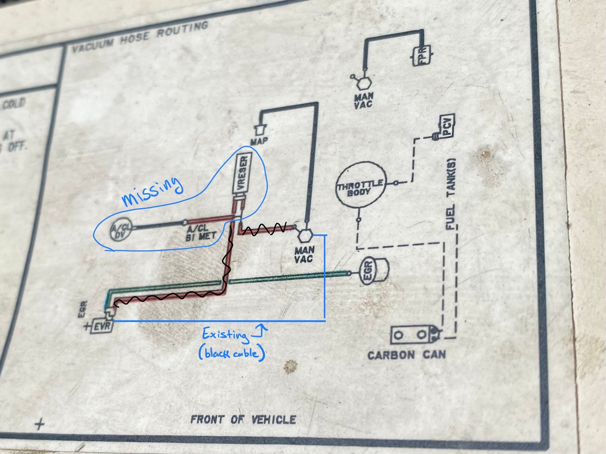 Thanks @RonD , super helpful place to begin. I've taken photos and marked up the vacuum hose diagram. For sure I'm missing the reservoir, and it seems the A/CL Diverter and Bimetallic valves. Any additional insight would be helpful?