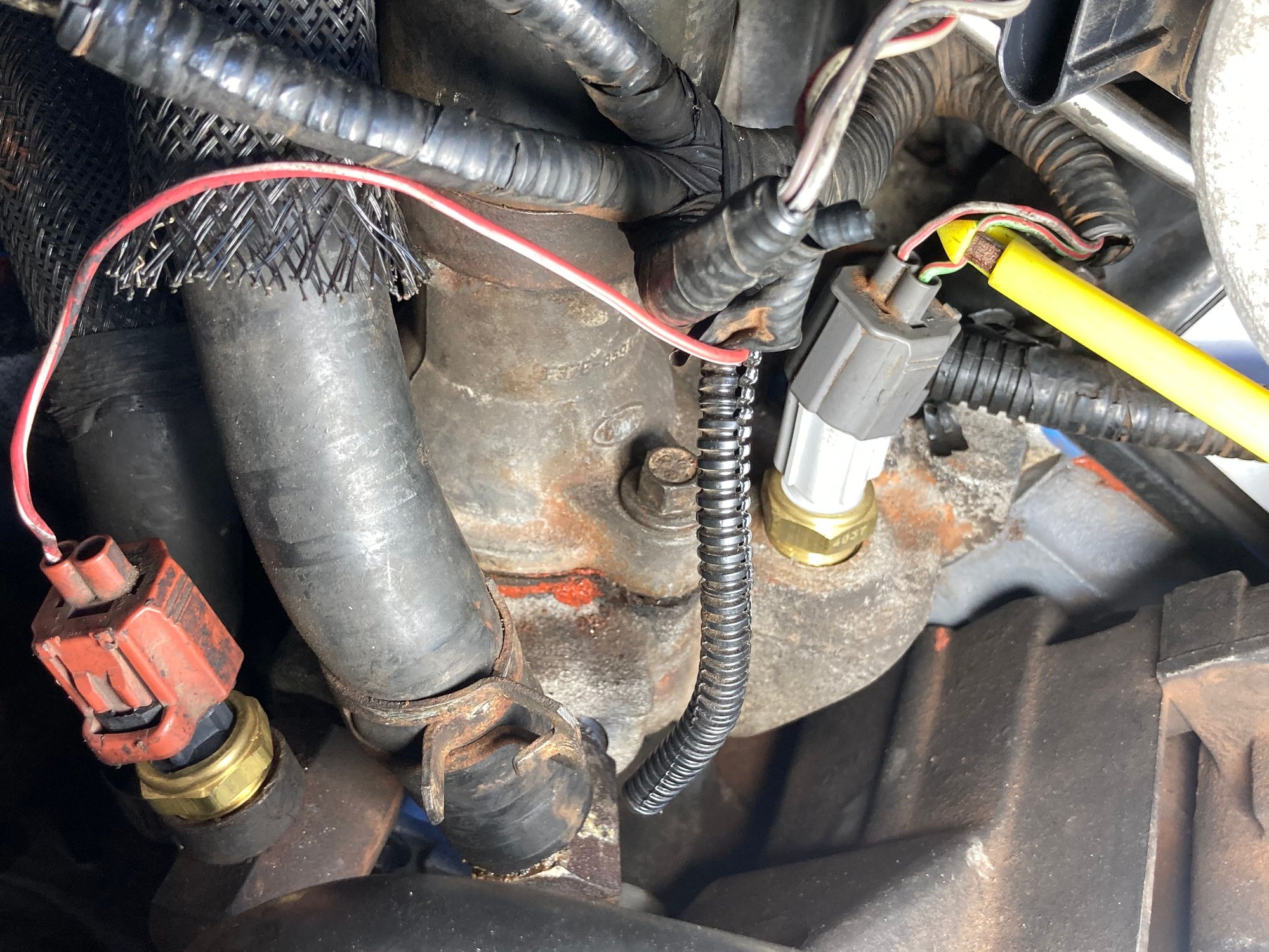 There will be a Temp SENDER which is 12volts and usually 1 wire, a red/white wire, it runs to the dash board Temp Gauge