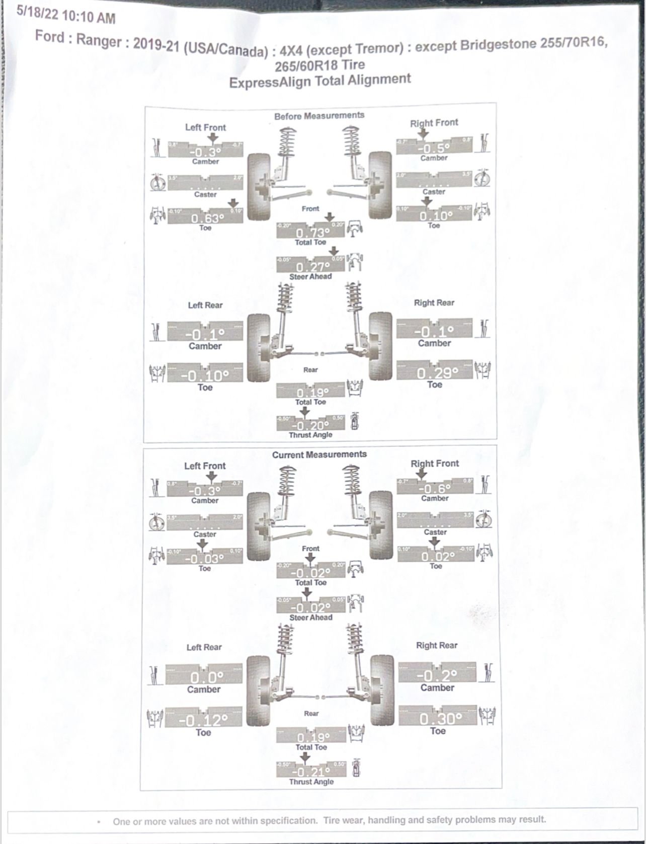 One thing I noticed on all the alignment data sheets is the shops are using specs for Ford Ranger 2019-21 (USA/Canada) 4x4 (except Tremor) (except Bridgestone 255/70R/16). The problem is my truck came with Bridgestone 255/70R/16 tires. I have brought this up with the shops and they tell me that this doesn't matter and that the specs are correct for my truck.
