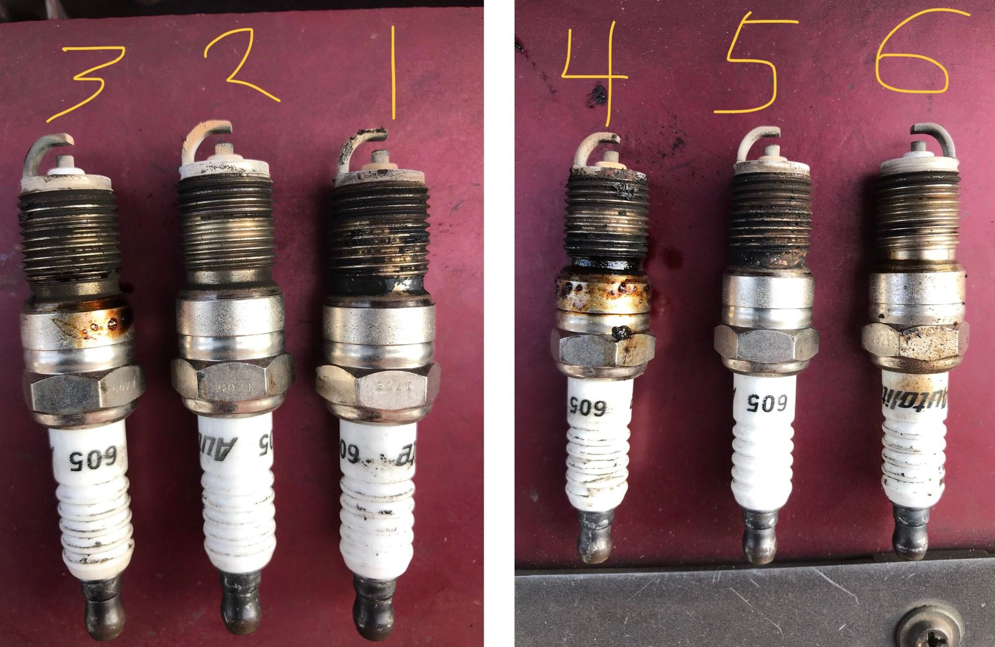 I took my regular copper plugs out yesterday and replaced them with new Autolite Double Platinum plugs. The truck now runs strong and smooth. I’m hoping to get more than 7,000 miles out of these plugs. Below is a picture of my plugs after I pulled them with their cylinder number above them. As you can see both the 3 & 4 had oil on them at their midsections.