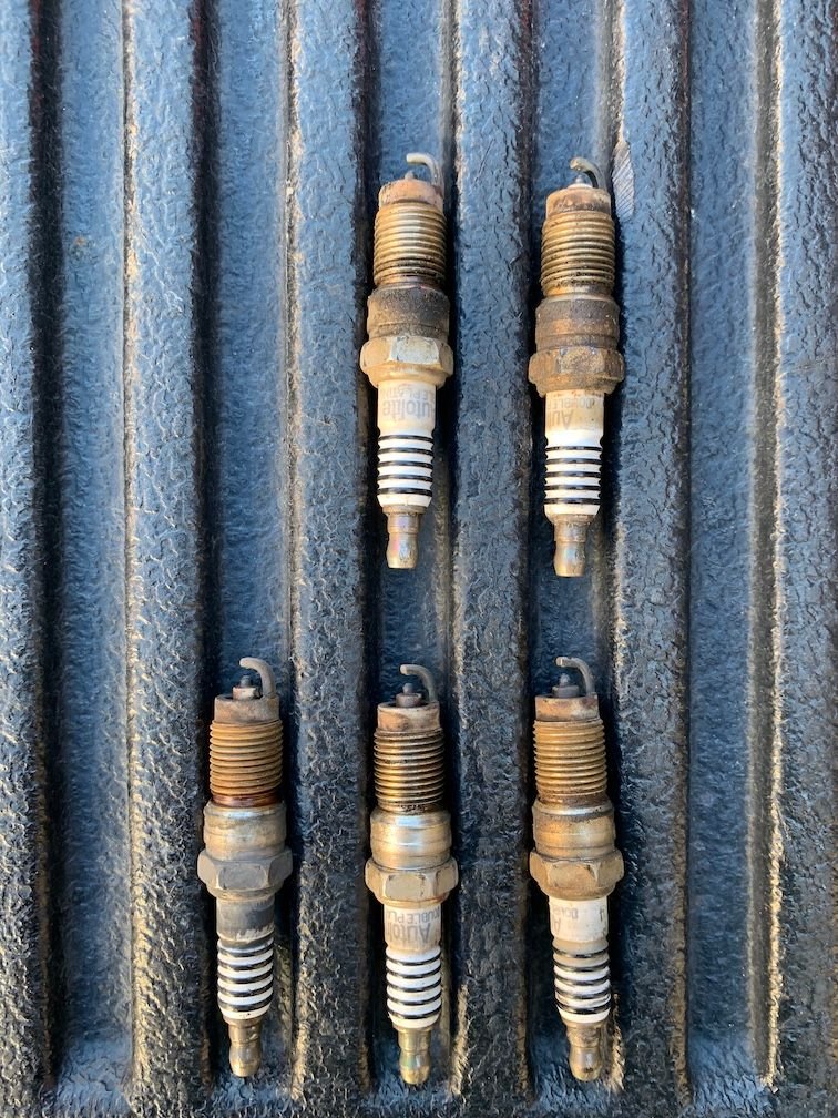 with that done, i moved on to replacing the spark plugs and wires. the old plugs seem in pretty bad shape - buildup on the electrode and gap way too big (measuring closer to .070 when recommended is .052 - .057).
