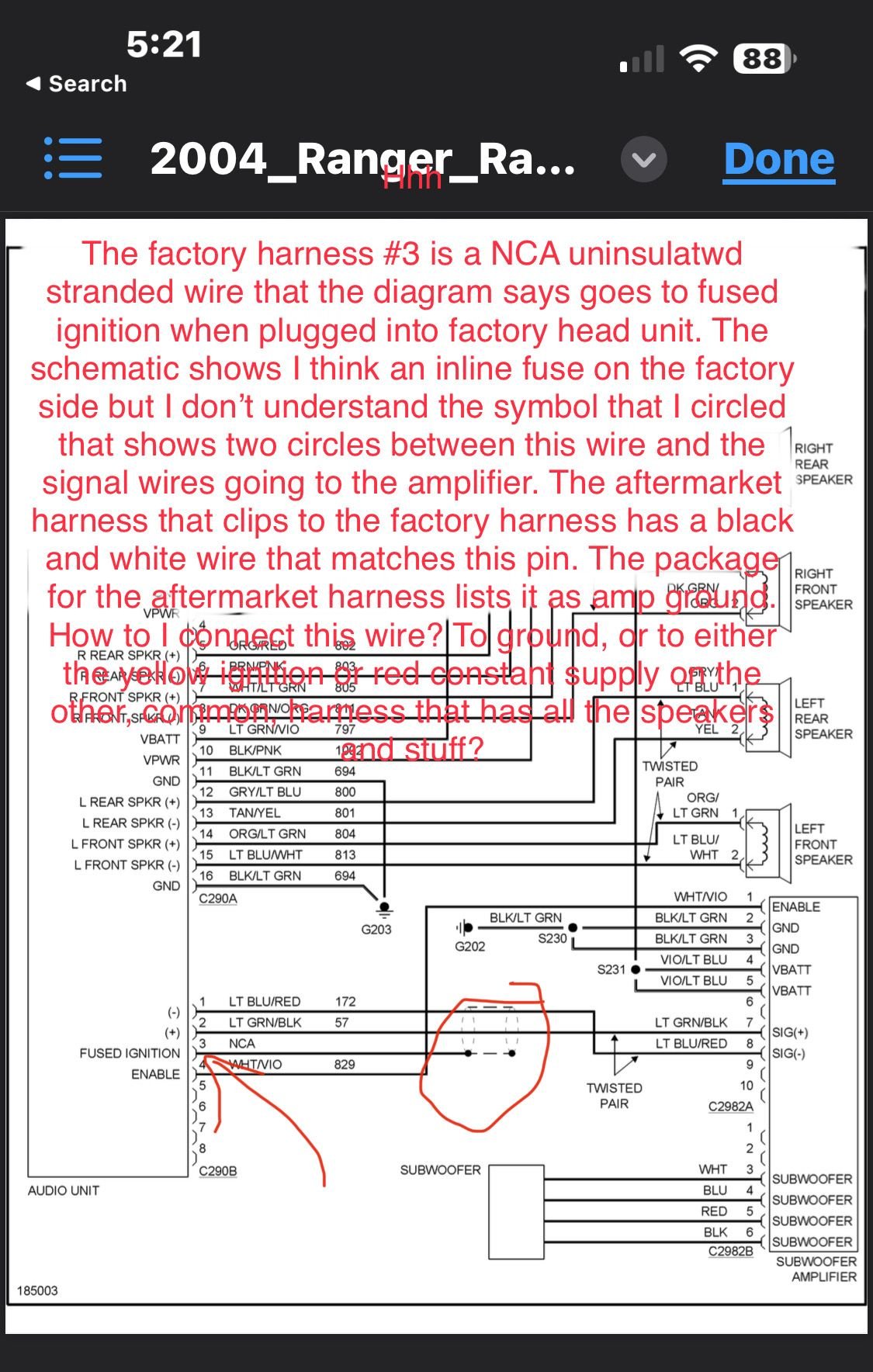 on the aftermarket that clips to the factory harness that runs to the amp, there is one wire I can’t figure out. The wiring diagram shows it going to "fused ignition". The factory wire leading to the factory harness is uninsulatwd stranded wire and shows an inline fuse.
