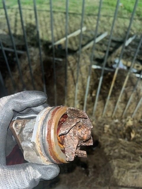 How hard could it be - take off the pulley - remove 3 capscrews, wiggle the old water pump out, then slide the new one in, replace the capscrews and pulley, replace the belt - I'm in business.... How wrong could I have been... Everything went well until the 'wiggle the old pump out' part.... After about 6 days of frustrating intermittent pushing, pulling, hammering, etc., the pump finally came out, begrudgingly. I had to remove the radiator and cooling fans, but that gave me better access to the pump. There was no way it was going to move by prying it axially, so I resorted to applying torque to the pump body with a pipe wrench, rocking it one way, then the other - I used a 2 ft piece of 2" pipe to extend the wrench handle to multiply the torque I could apply. I also ended up hammering on the pulle Notice the flanges are missing... Thankfully, I had a pipe wrench narrow enough to fit in the snout.