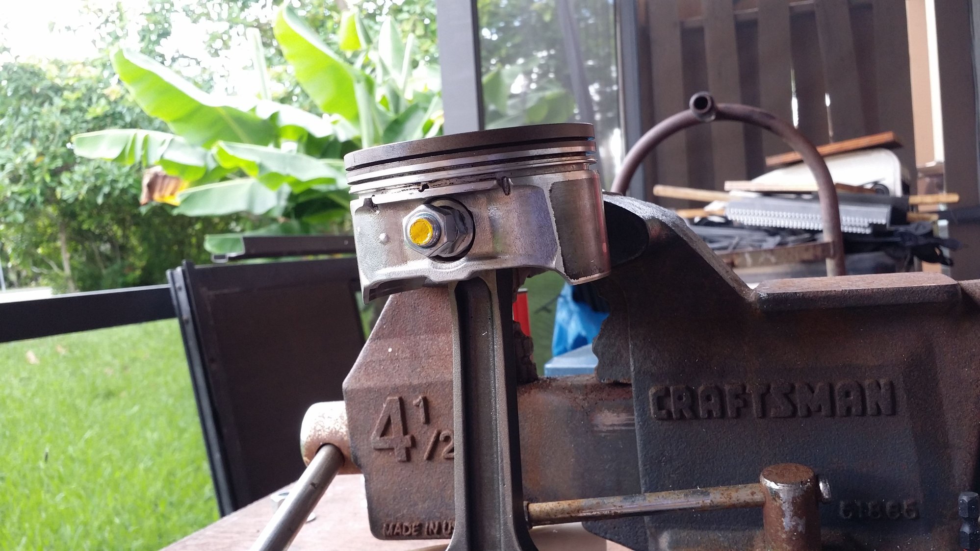 Today I removed the pistons from the connecting rods. I just used a vise and some 3/8 allthread. I grinded a 1/2" nut to fit through the piston hole. If you do this make sure to align the wrist pin so it does not come out and scrape on the vise. Also make sure you do not scrape the piston hole if you want to use your pistons again. Make sure to use some oil on the nut you tighten to pull the pin out.