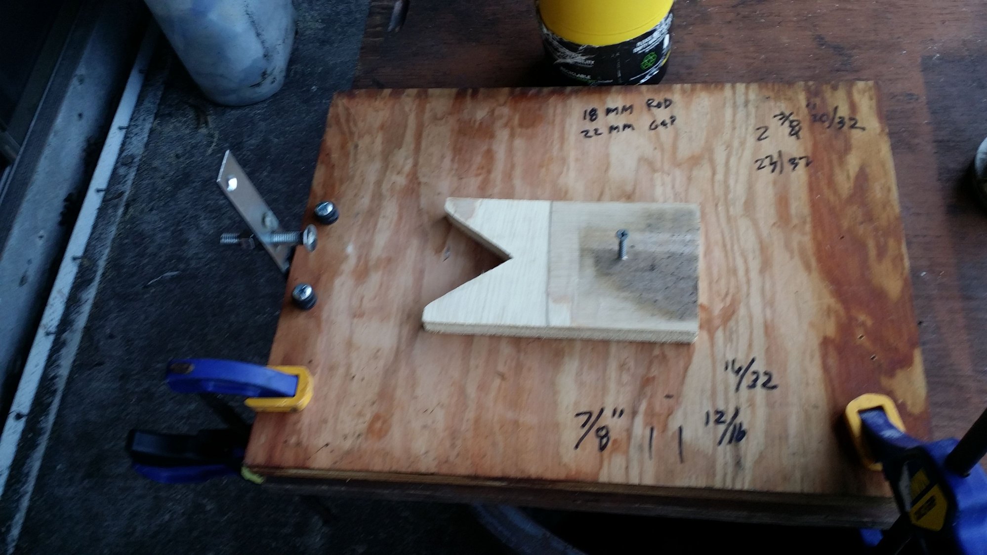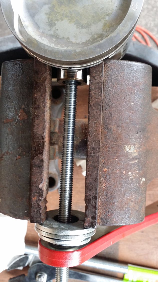 I made a Device to help put the new pistons on the rods. Getting the measurement right was the hardest thing. With my new pistons there was 4mm of play 2mm on each side the the rod when it was installed on the piston. With the divice I just needed to get the measurement set once and then do them all.
