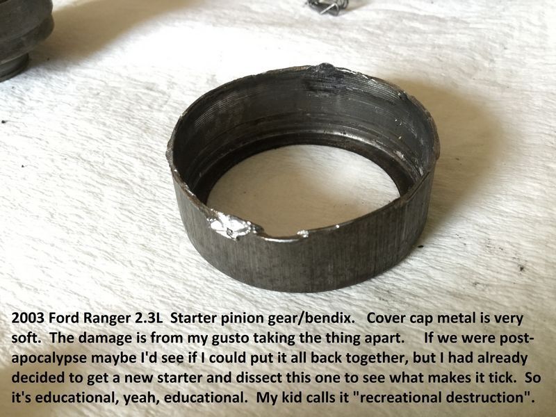 Over the weekend I pulled the starter from my 2003 2.3L. I decided to at least try to rebuild it and taking it apart was pretty easy. Until I got to the pinion/bendix gear. Short story.... I can't find rebuildparts anywhere, and i spent WAY too much time trying. (You did warn me, Ron D....) So now I have a new starter in my truck and I decide to take the old one apart some more to see what makes it tick. When I was researching how-to and looking for parts I never ran across pics showing this thing's guts, so I thought I would share.