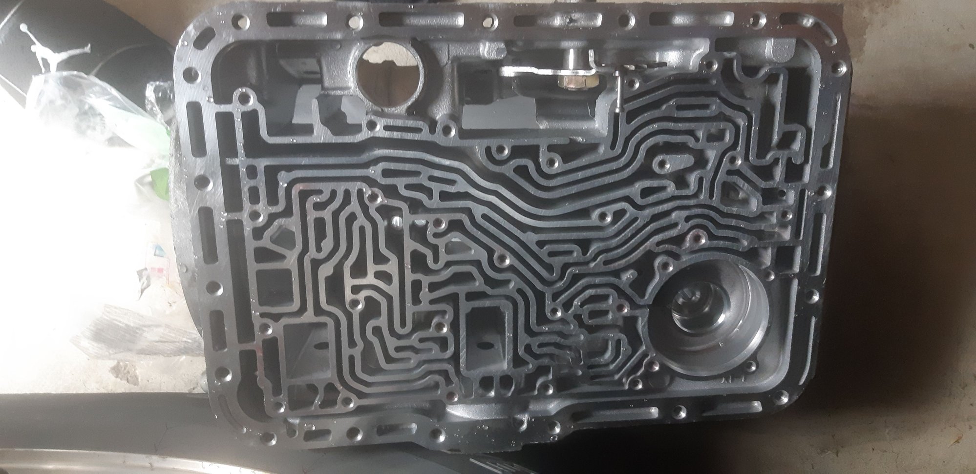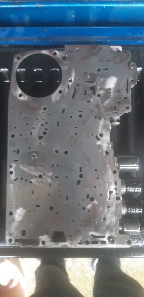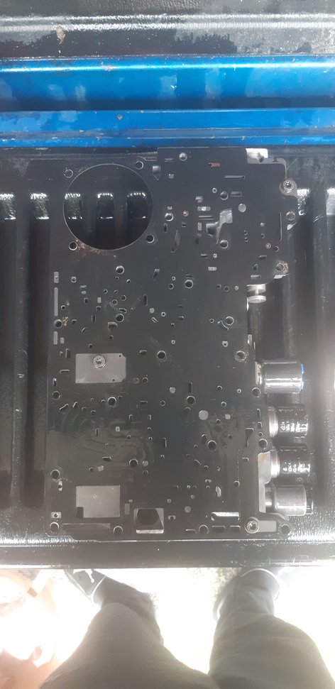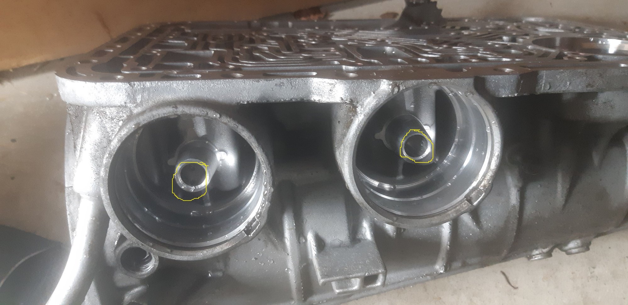 . Other issues that I thought might be a proble are the servo rod bores on the sides of the transmission, they don't look horrible, but you can tell there is wear.....and there was a build up of material in those servo piston bores. The only other thing I can think of is the incorrect valve body was installed on it(maybe for the 4r44e?). .......can you please look at my pics and see if this is the correct valve body for the 5r55e and gasket? I'm attaching a pic of the valve body with the gasket on top of the plate, and one without. I've also attached a pic of the servo bores I'm concerned about(inside the circled yellow areas where the rod goes through). Also one of the return springs is longer on the side servos than the other(should they be that way or same length). I wasn't paying attention when I was removing them and don't know which one had the longer return spring. There is water on the trans case in the pic because I had just finished pressure washing it, sorry about that. Thank you so much.