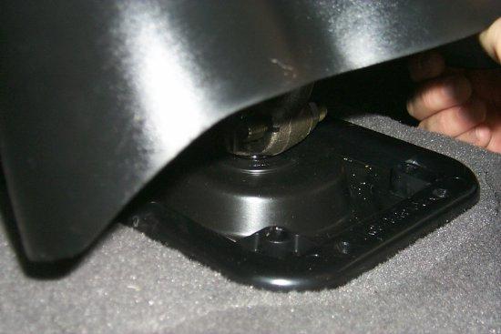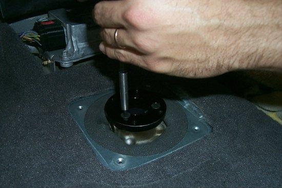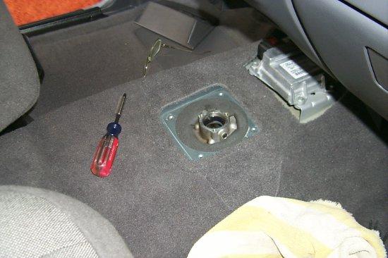 With the plate removed, you can next see the shifter base. Fold down the floor insulation around the base, so you can access it better.