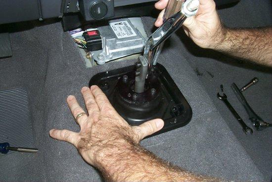First you must remove the factory shifter. There are two screws in the console under the front of the boot. You only get a small amount of room, but it's enough to remove the bolt that holds the factory shift arm.