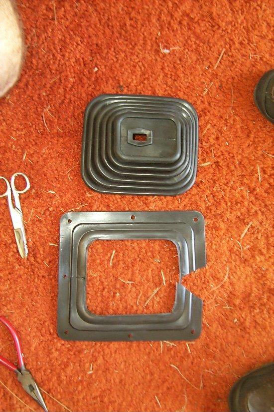 The first destructive modification is to cut the stock inner boot to accommodate the Hurst shifter. You must make the hole 2-1/2 inches. Use sharp scissors to cut the boot.