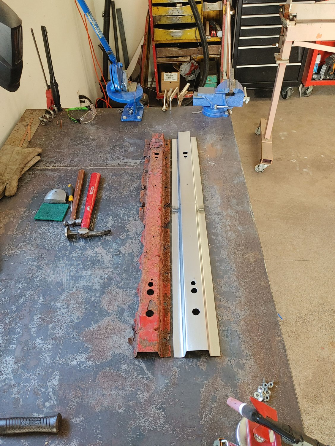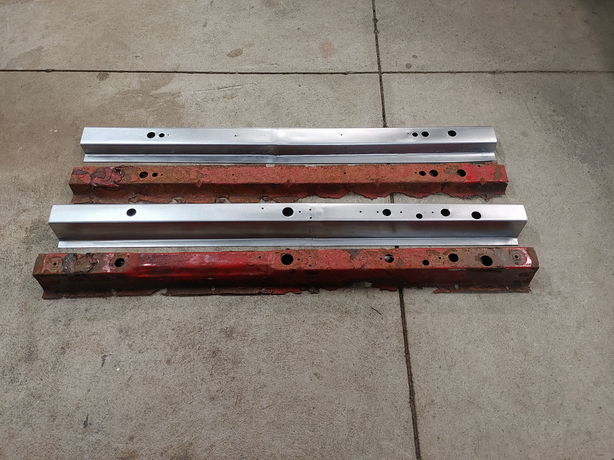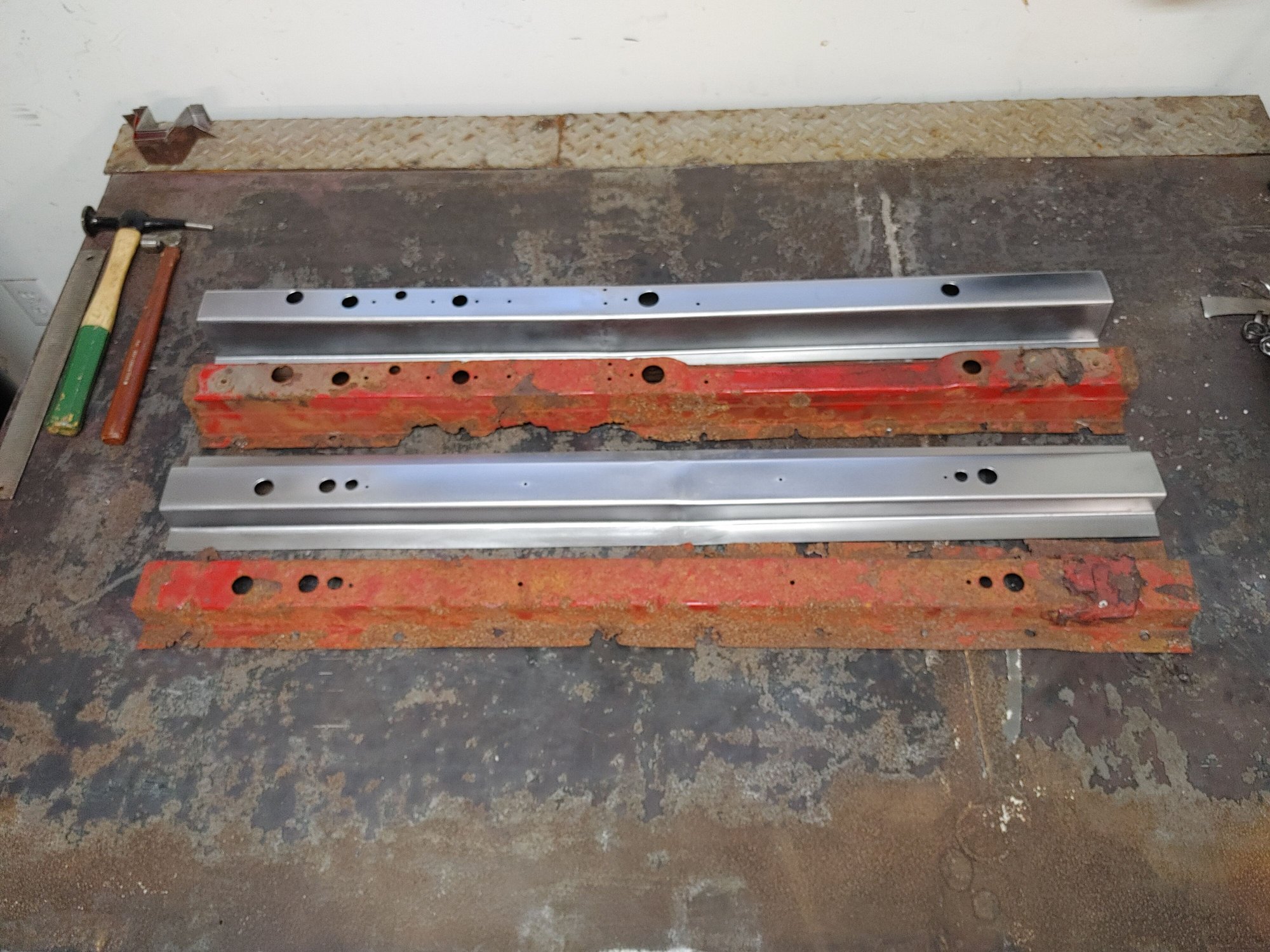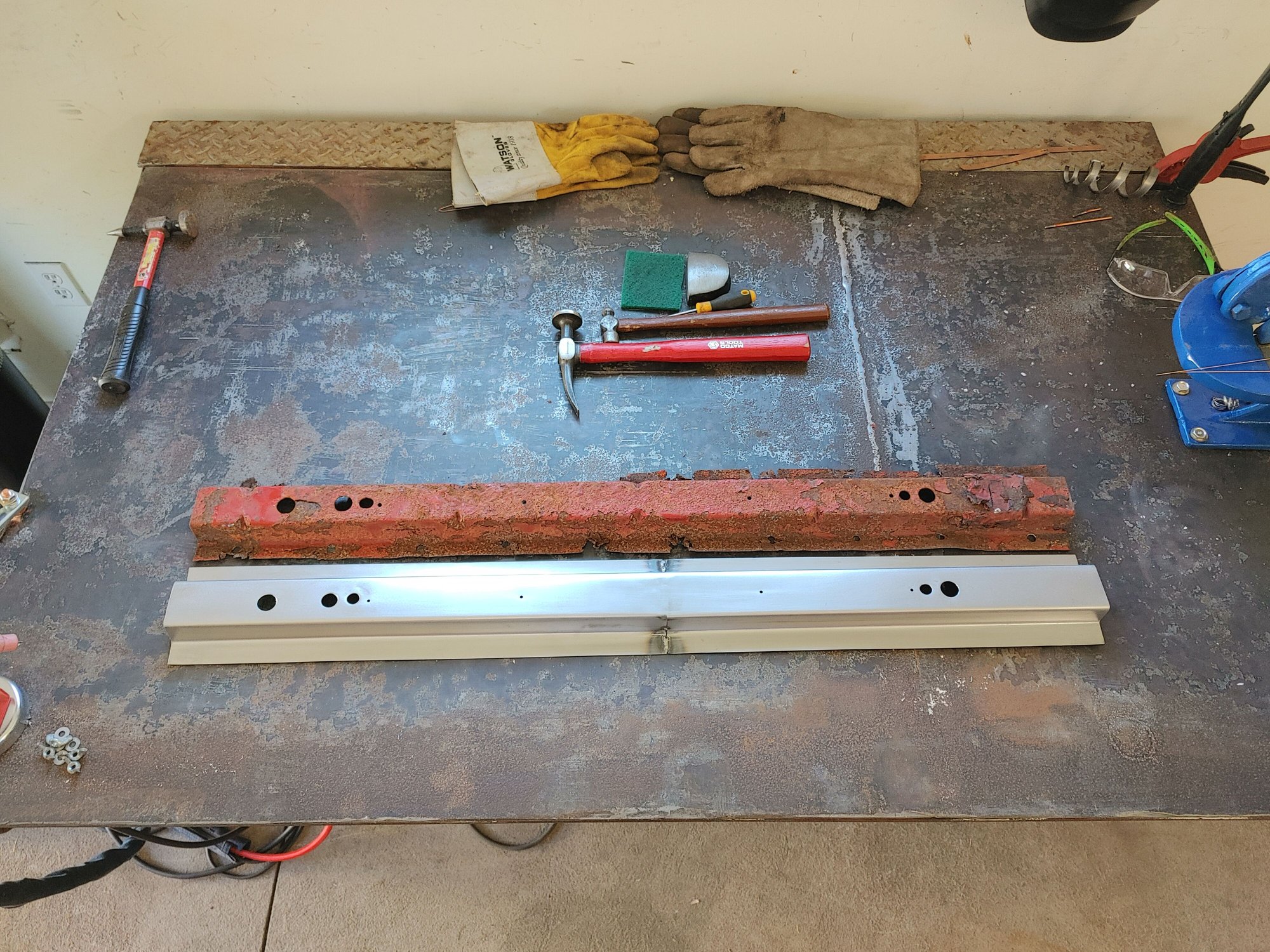 First you need to drill out the spot welds to remove the rotted out cross members, this was easy for me as I removed all the bed floor around them as I planned on replacing it as well. Once you have the spot welds drilled out you can remove them from the floor and start measuring for where you need to make your bends with your new sheet metal. I have a cheap 3 ft brake but the cross members were 38' in length so I cut out with my shear 2 matching pieces of sheet metal in 19' in length and appropriate width. Once I measured and scribed where I needed to make my bends I went ahead and made them. Its a good idea to practice on a piece of scrap to make sure your bend measurements are right, also both cross members were the same length but all other measurements were different. Once both pieces are bent I fit them up and tig welded together. Once welded I ground smooth and made a template with tape on the old piece where I needed to drill all the holes and transfered it on the new piece.