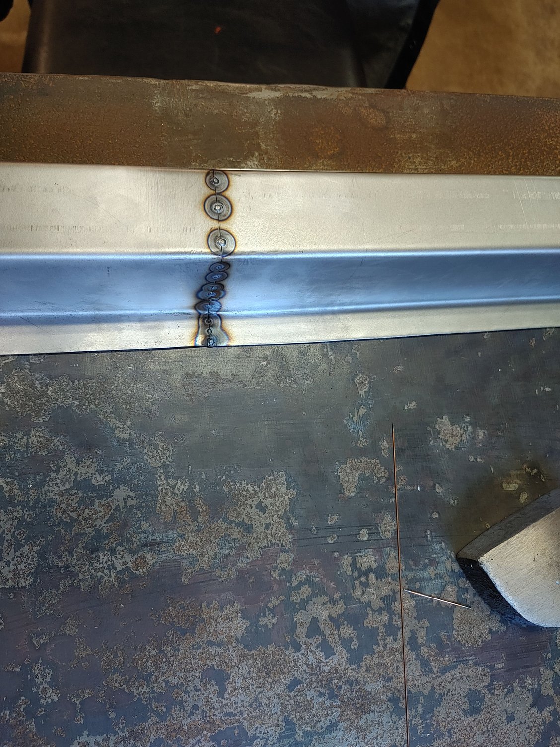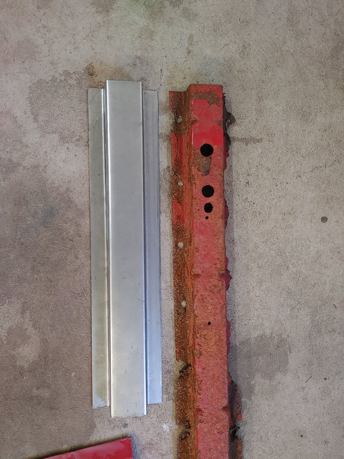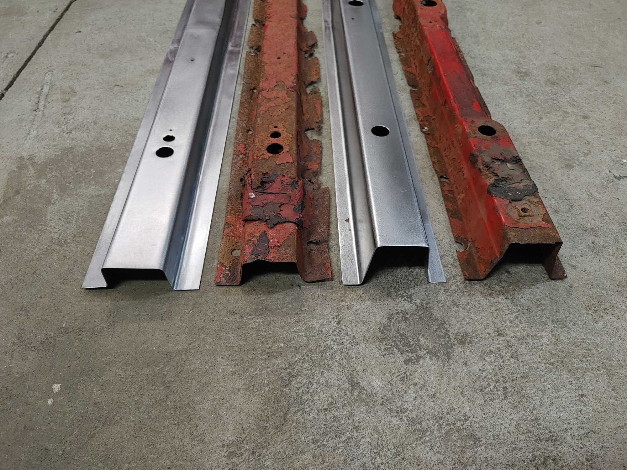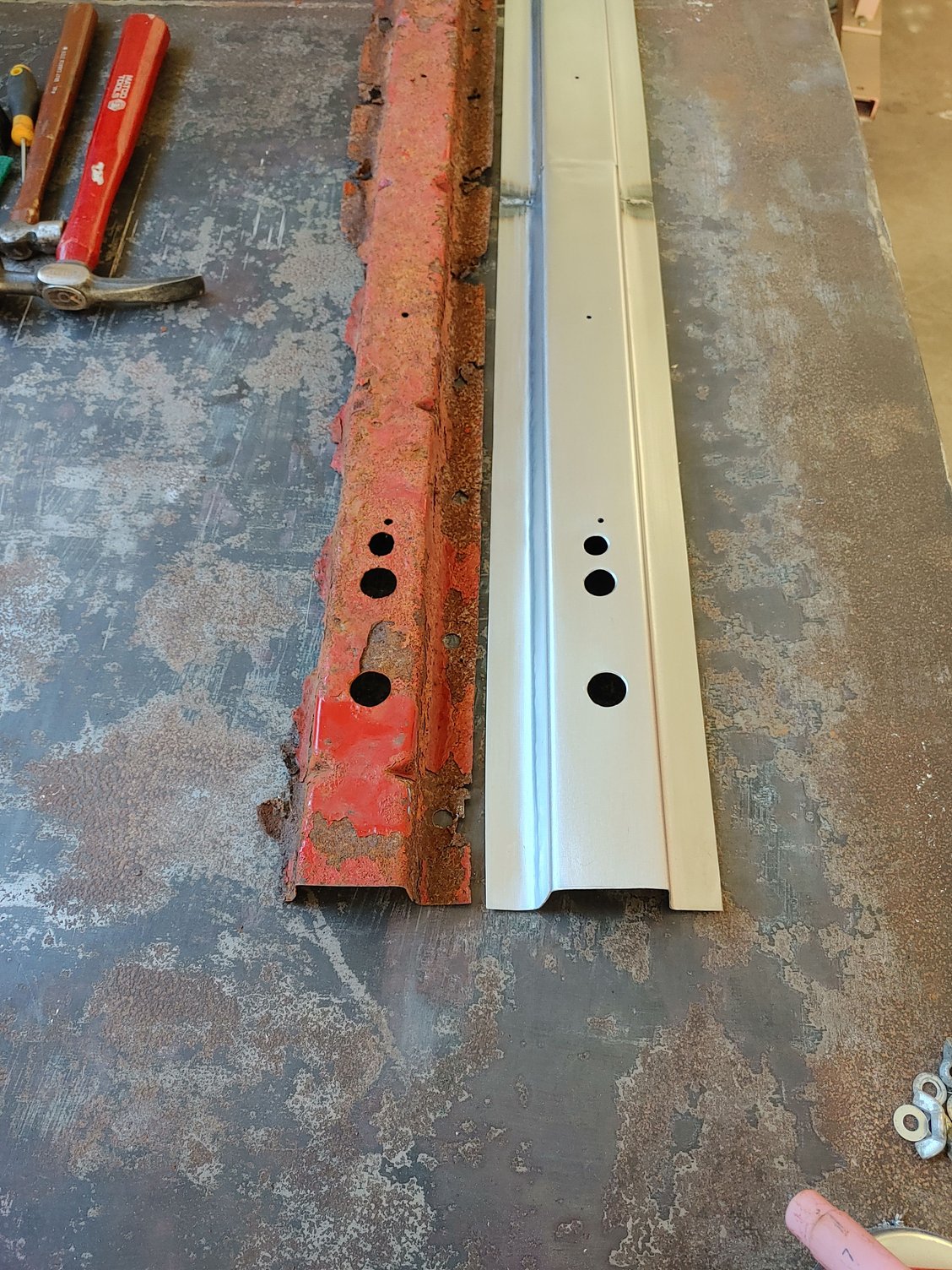 First you need to drill out the spot welds to remove the rotted out cross members, this was easy for me as I removed all the bed floor around them as I planned on replacing it as well. Once you have the spot welds drilled out you can remove them from the floor and start measuring for where you need to make your bends with your new sheet metal. I have a cheap 3 ft brake but the cross members were 38' in length so I cut out with my shear 2 matching pieces of sheet metal in 19' in length and appropriate width. Once I measured and scribed where I needed to make my bends I went ahead and made them. Its a good idea to practice on a piece of scrap to make sure your bend measurements are right, also both cross members were the same length but all other measurements were different. Once both pieces are bent I fit them up and tig welded together. Once welded I ground smooth and made a template with tape on the old piece where I needed to drill all the holes and transfered it on the new piece.