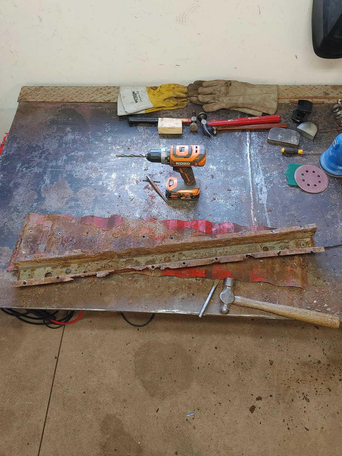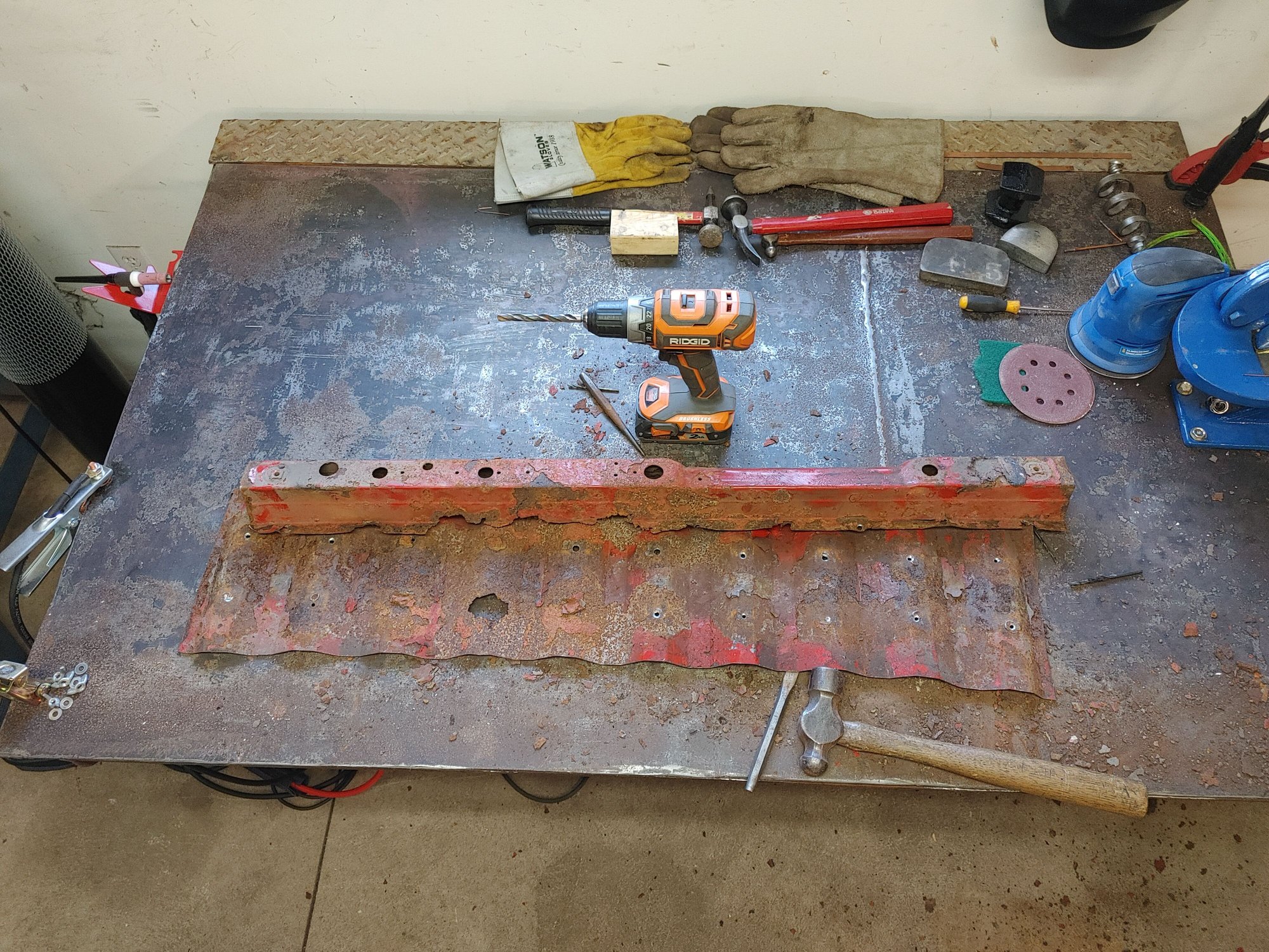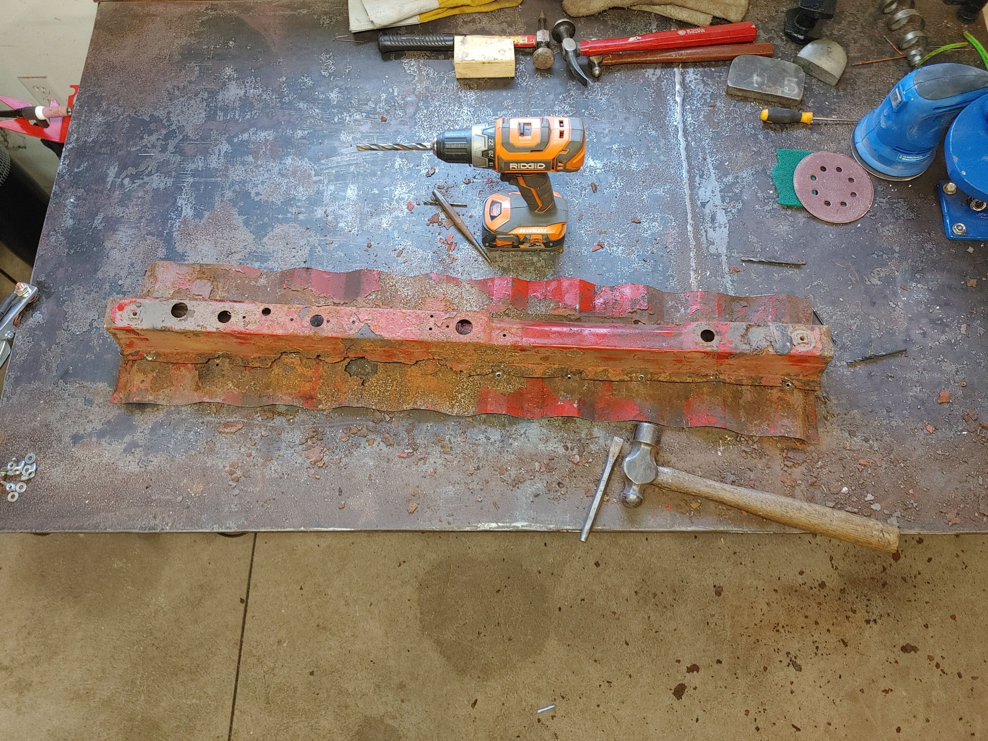 One half of one brace made along with some of the bed floor I need to replace 2 halves partly welded together, ran out of argon halfway through welding Drilling out the spot welds Bending up one half and it matched well Tack welding together Both cross members completed