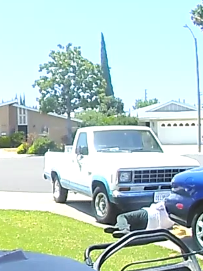 I am at a lost. It's sad, but a stranger came onto my neighbor's property and removed a part from underneath his 1987 Ford Ranger XLT 2WD that was parked in his driveway. My ring camera caught the whole event. My neighbor's not mechanically incline, so I am offering to help him to make sure the vehicle is safe to drive without spending $$ to have it inspected. I've tried to identify/match the part that was removed by inspecting the area underneath the truck's engine and front suspension, and reviewed online schematics of the truck to identify the removed part without success . We can't find any markings underneath the engine and around the suspension that would show what was removed, so I have attached a photo of the stranger holding the part as he was getting up from the ground in front of the truck, and also a photo of the stranger underneath the vehicle. Please does anyone know what the part he could be holding? It appears the truck model is not a complicated design, so I am hoping someone here can recognize the part that was removed. Thanks!