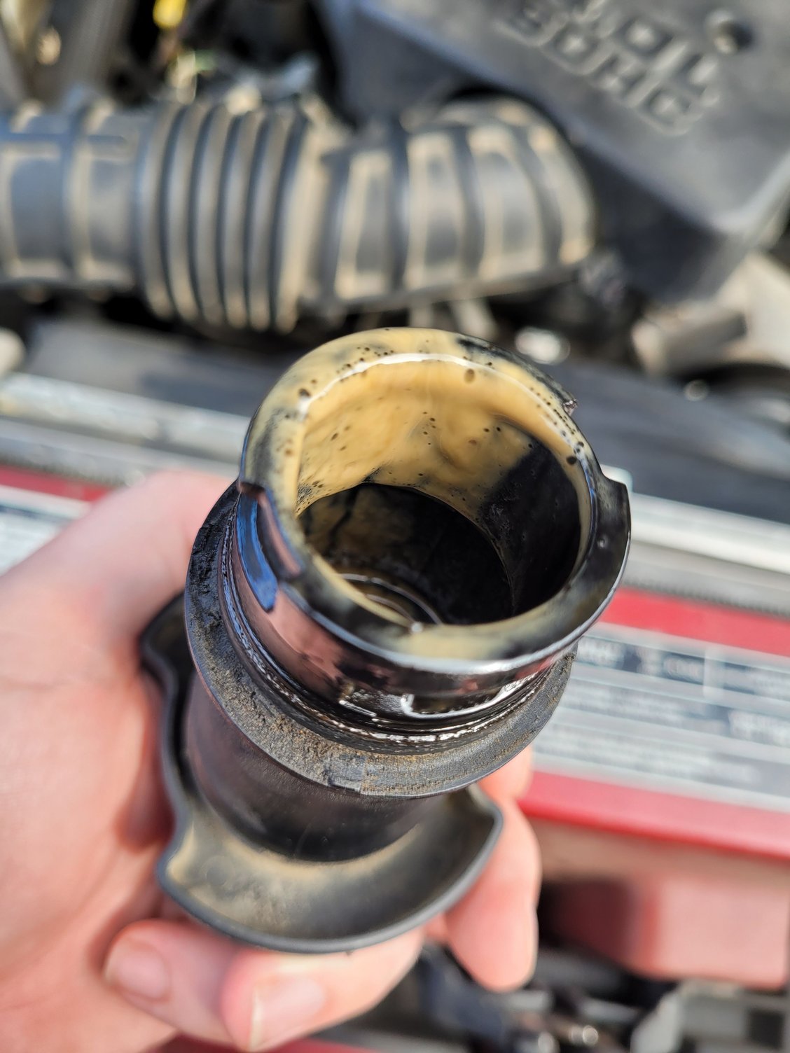 That can be just condensation and a sign you need a new PCV valve and to clean PCV system hoses