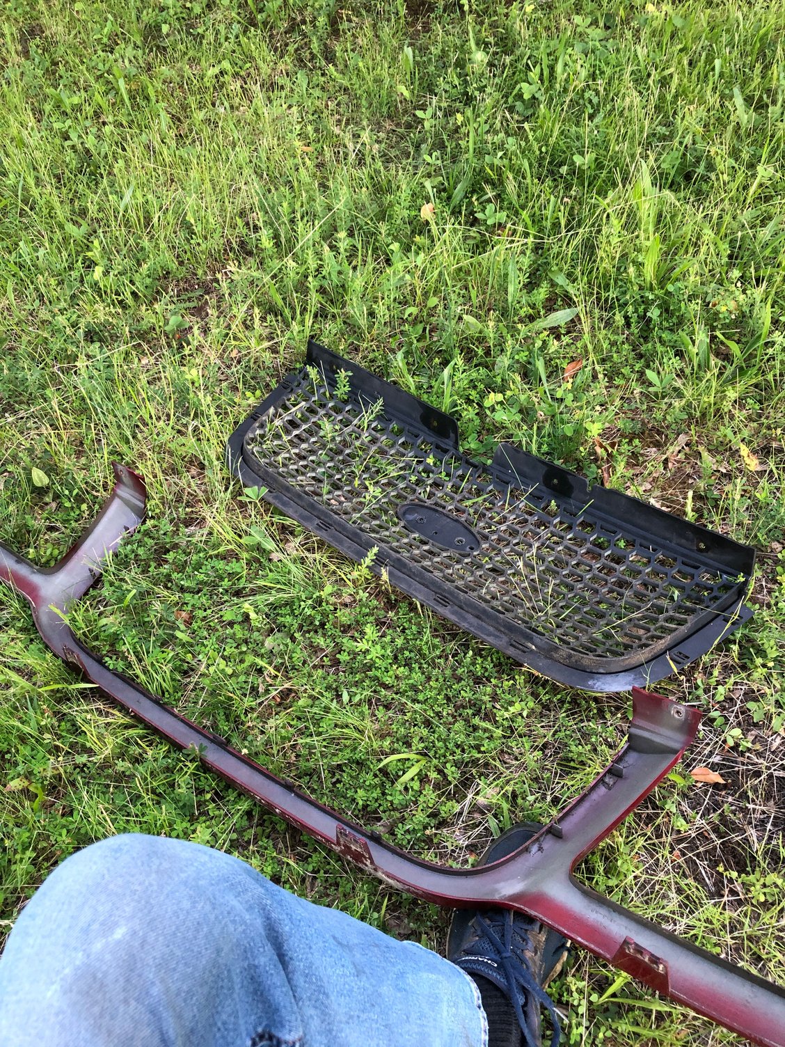 The front clips is now out, place grille on a blanket on the tailgate. Using a 10mm wrench remove the retaining nuts from the back of the oval emblem.
