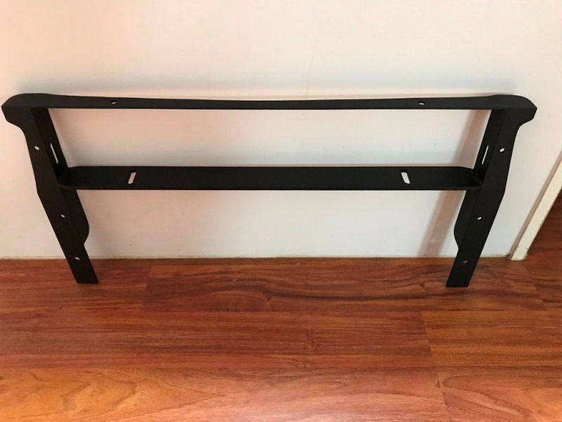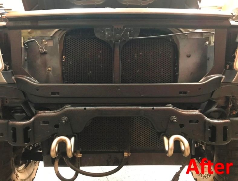 I modified the opening behind the grille to fit the bracket I fabricated. I cut out the center post though it ended up being unnecessary. I also had to move the transmission cooler down lower. I took the opportunity to spray undercoating on everything to freshen things up.