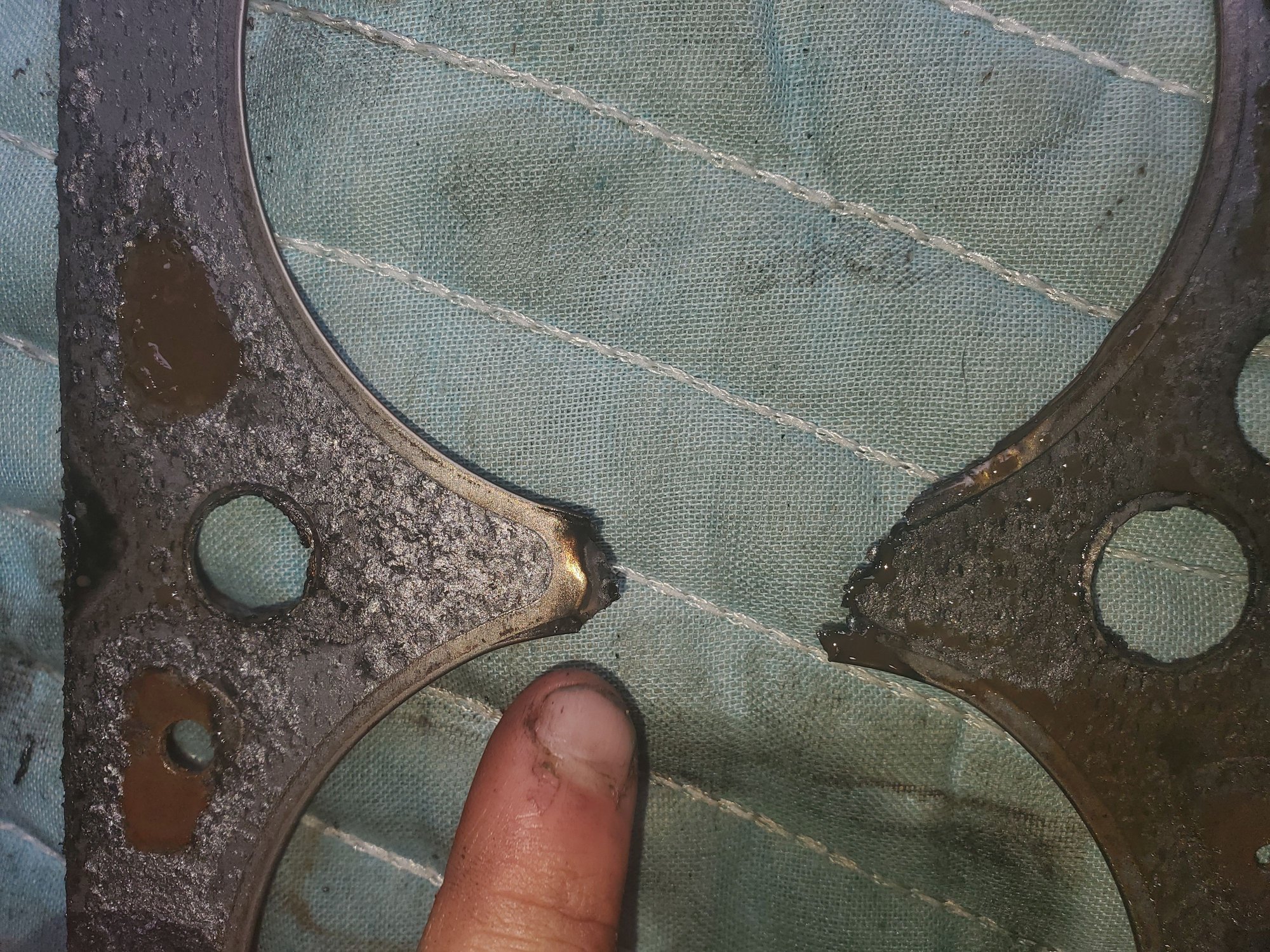 All looked good except the large burned out spot in the head gasket between cylinder 3-4. So it seems it would not build pressure due to air moving between the two cylinders.