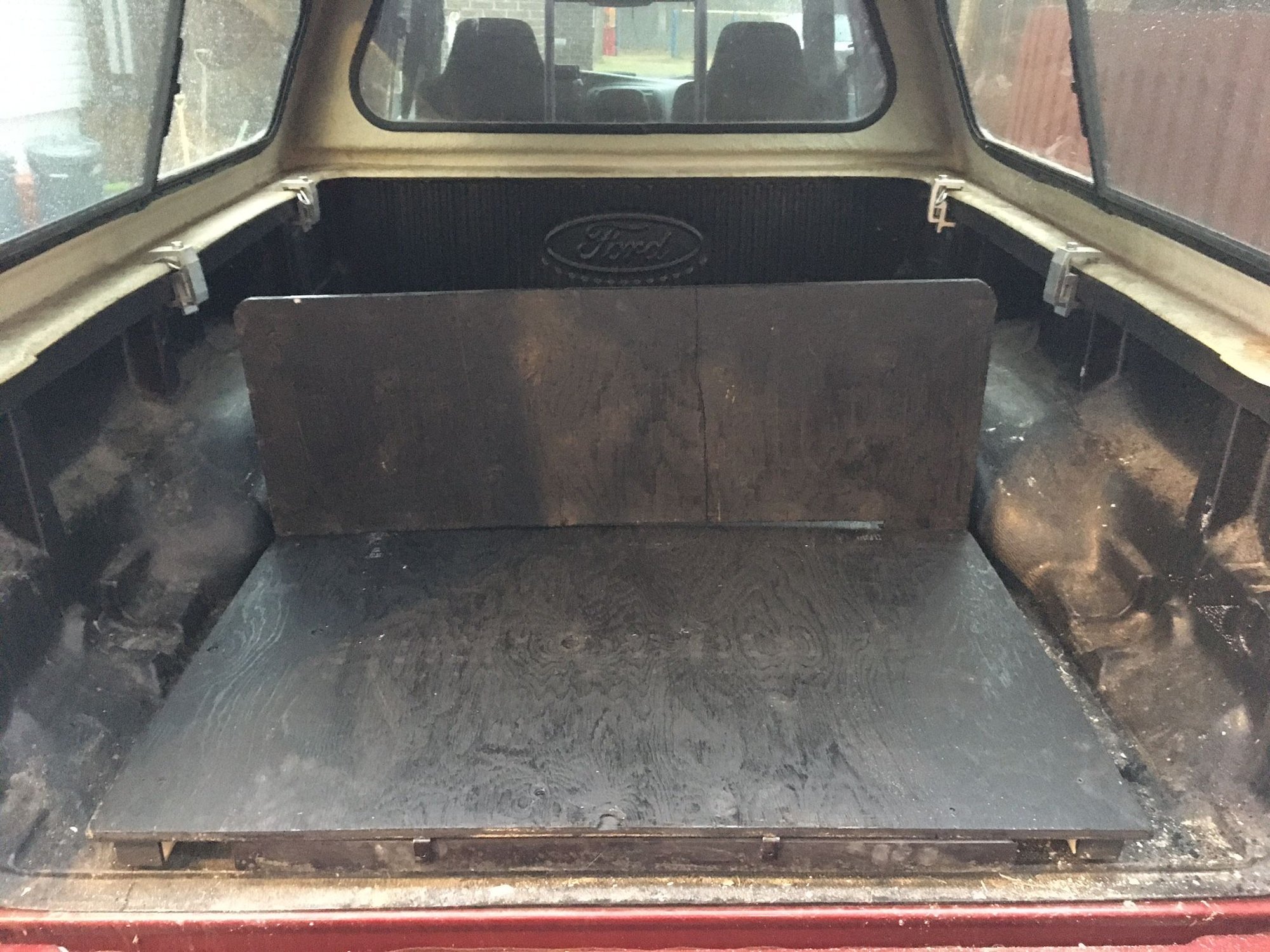 I have just purchased a 2007 extended ranger with cap 4.0l 2wd 57k with limited slip rear end but found it still sliding around more than I total of three 30 x24 x 1.5" think patio stones added, Each weighing 100lbs. I did trim .5" off of the last one and painted the edge black. added brackets to surround the patio stones to prevent shifting. also added 1.5" wood to help support the sides (the picture is showing the end that would be toward the cab). Painted the plywood black to match the box, also added slots 24" in from the tailgate to add a divider Created a divider from the extra piece of 1/2 plywood to stop small loads from shifting forward, it just drops down snugly into place. patio stone and divider added.
