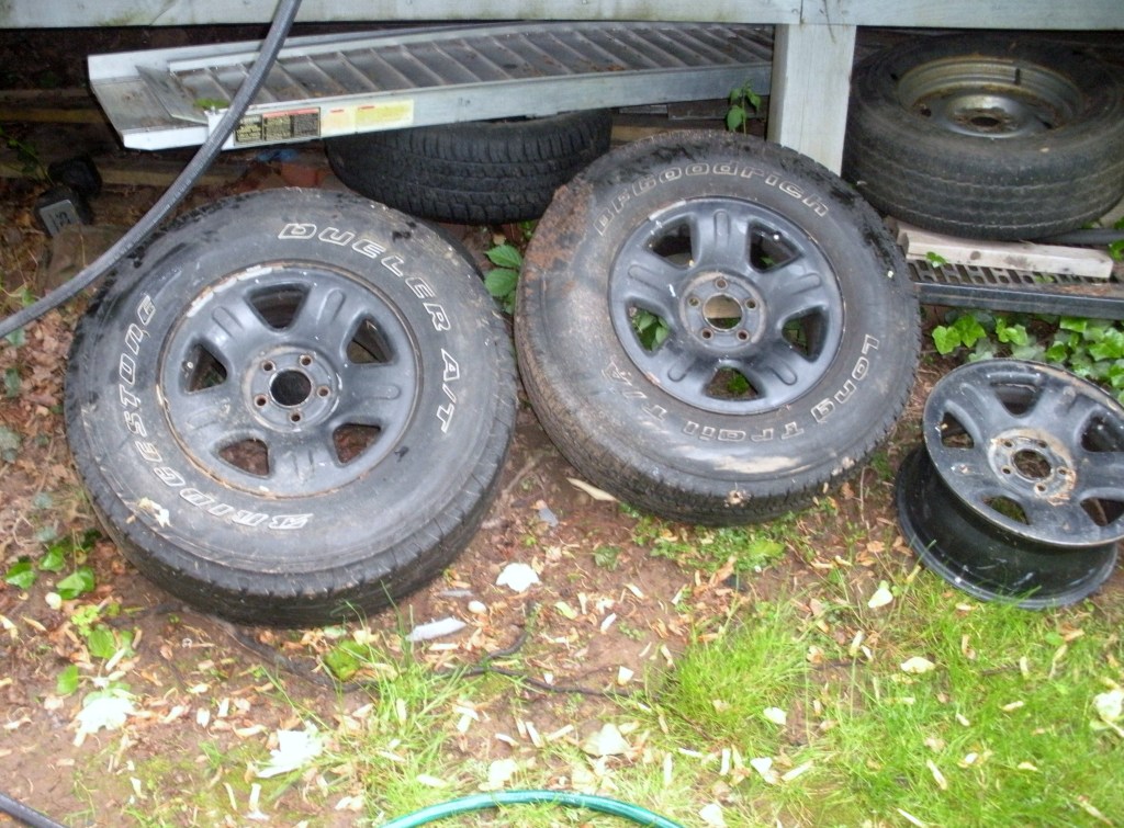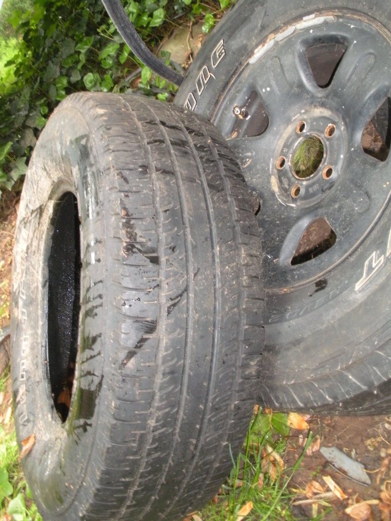 one of the bfg long trails still has tread, the dualer is done. they have dirt on them if you need to see them clean let me know.