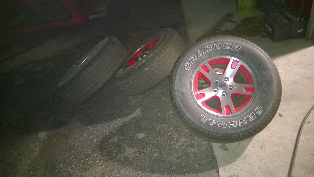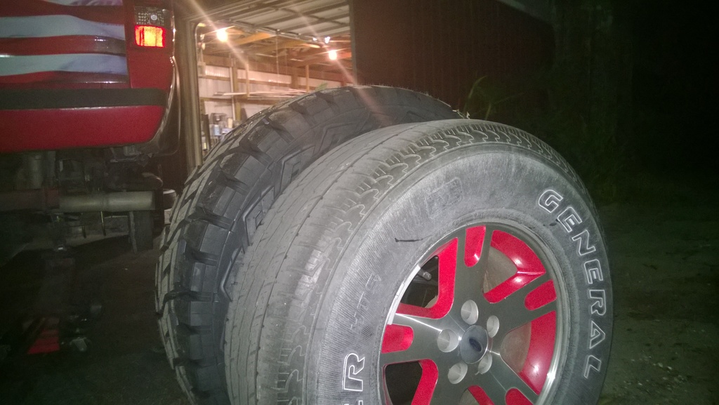 Well, I got the topper back on and got the truck all buttoned up for now. Stereo is back in and second battery is hooked up and working perfectly! Also got my CB all hooked up and got the Antenna mounted. Also had to fab some makeshift bumper brackets out of 1" angle in order to support the whip mount. Also got my spare- 35x12.50x15 Mud Claw for $220 because the tire shop didn't want to give me change for $225 when I handed him all twenties. It sits cozy in the bed beside the second battery