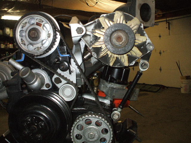 I realized tonite that since Im converting the truck to a manual steering box that I had no way to mount my alternator since it used the Merkur powersteering pump bracket. Well after some digging around I came up with my own adjustable mount with crap I had layin around. BTW, thats a Powermaster 140amp 1 wire that still needs a cleaning.