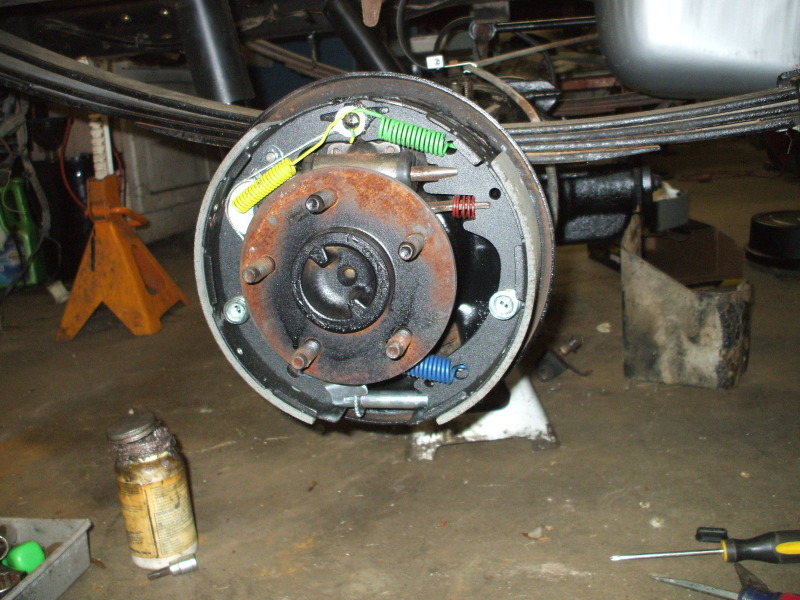 OK....rear axle is finished an under truck now. Here is the break down. Explorer 8.8 with 3" taken out of drivers side tube,using two passenger side stock 31 spline axles. 3.55 gears and a Auburn Pro. All new bearings and races through out and a TFS girdle. Only original brake part is the backing plates. New drums,shoes,wheel cylinders,hardware,adjusters,lines and hose. Even have the stock parking brake cables hooked up and working. Big milestone for me and project cuz now the wheels and bed can go on.