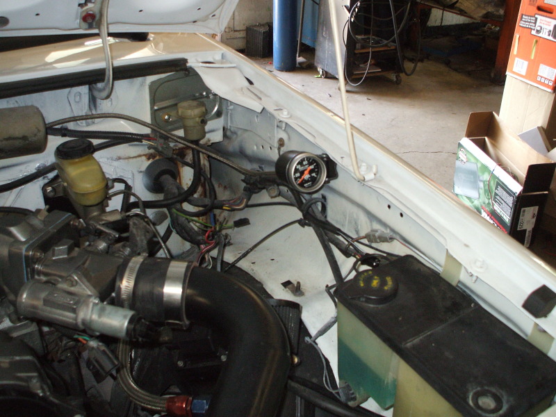 Mounted a fuel pressure guage under the hood.I have yet to find a good small guage for the rail that reads correct so I just went with a good old Autometer I can trust.