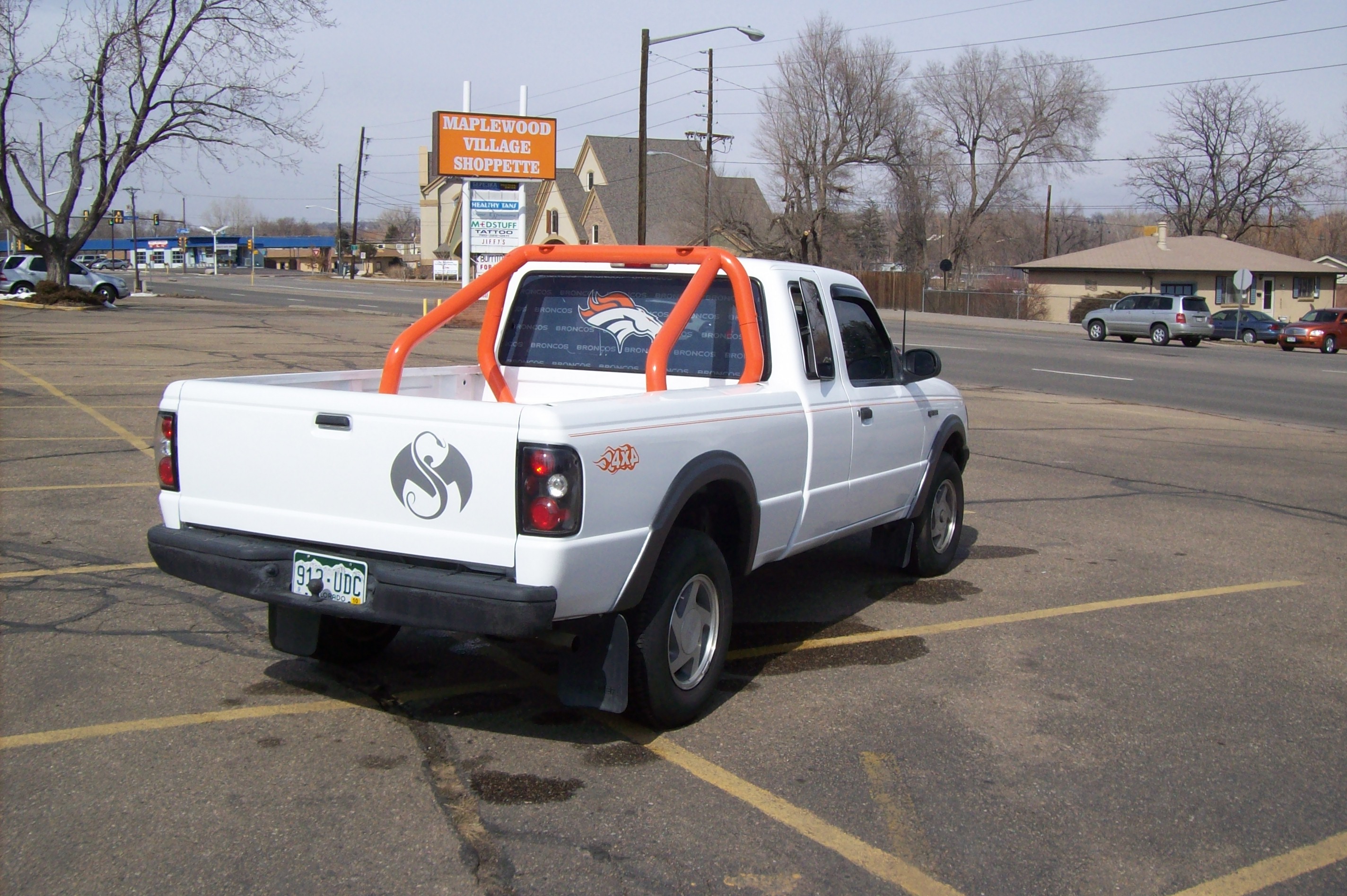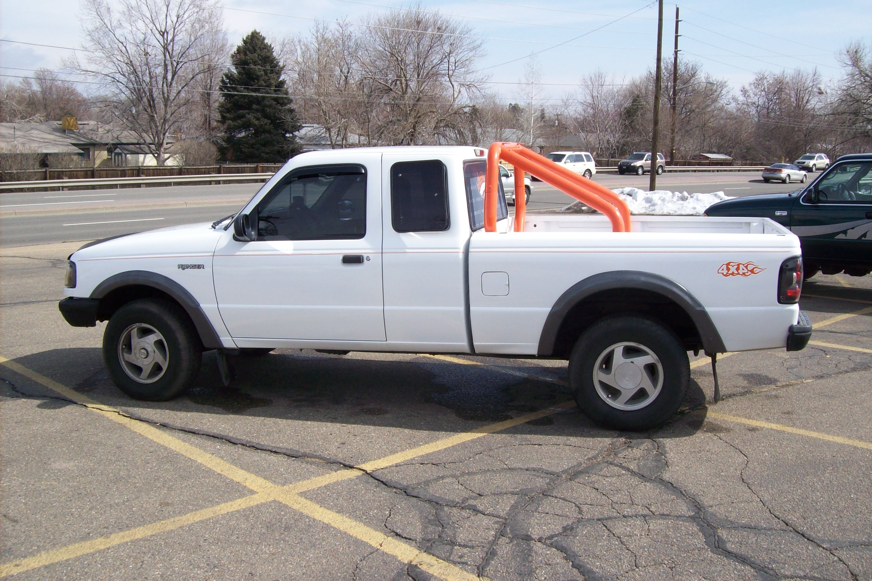 My aunts 93 Ford Ranger. 4x4 4.0L. A lot has changed since I have taken these photos. Still got a ways to go with it to get it looking good. BTW roll bar is no longer orange and she has my old wheels wrapped in some new 31s and I did a roll in bedliner job for her. And no longer has the bronco sticker on the back window. Next I gotta get her to get some diff headlights, repaint all the flares and grill.