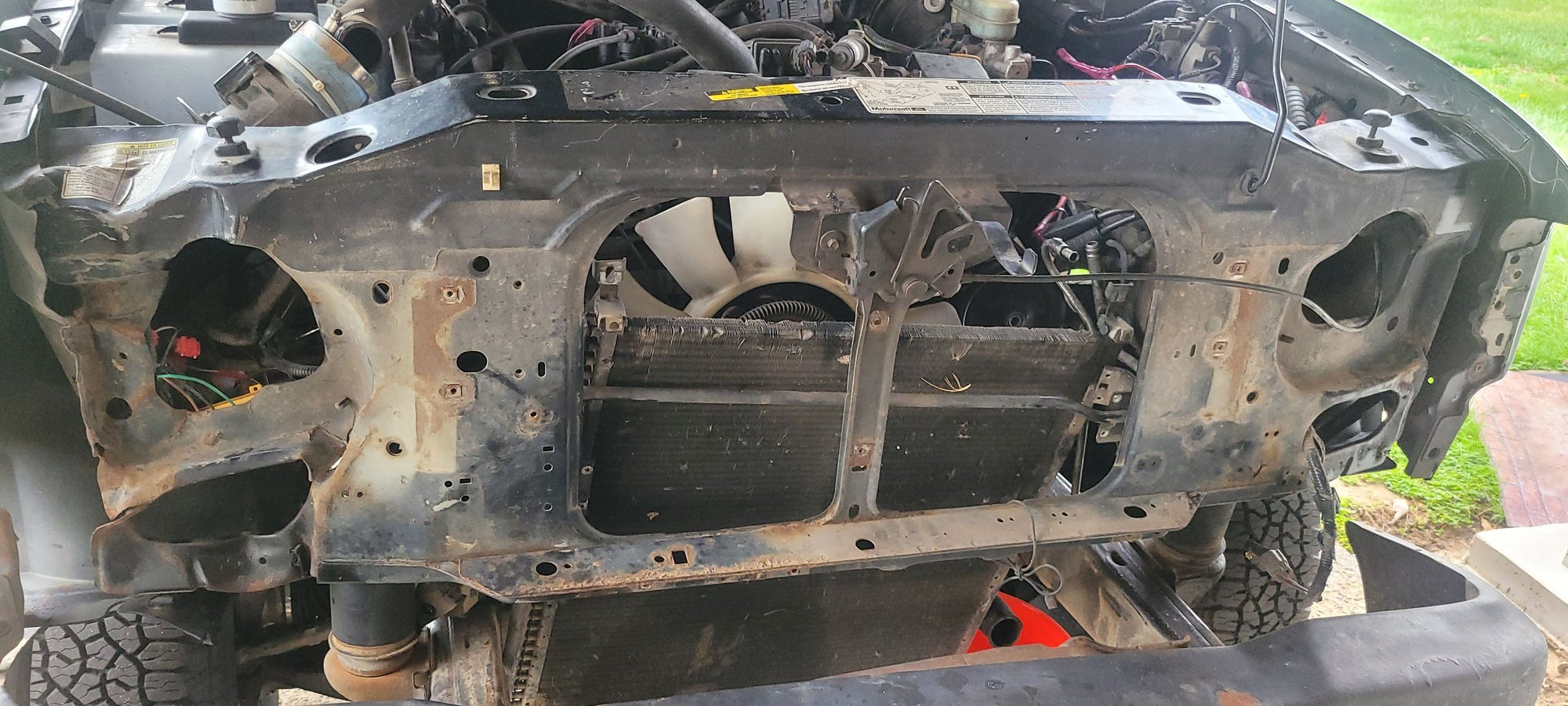 When i got the truck i didnt know it until after the fact that it had been hit on the right front at the corner. (I got it from a friend who owns a security company, it was a site vehicle so i was familiar with the truck but didnt look at it extensivel but did crawl underneath it and virtually no rust. Thats why i got it (plus restoring it and these trucks a work mules). I didn't know exactly how involved doing the support was going to be. It took me 3 days to remove everything, bang the metal back into place and reinforce it then rivet the new support in and put it all back together. I never want to pull another one of those again lol