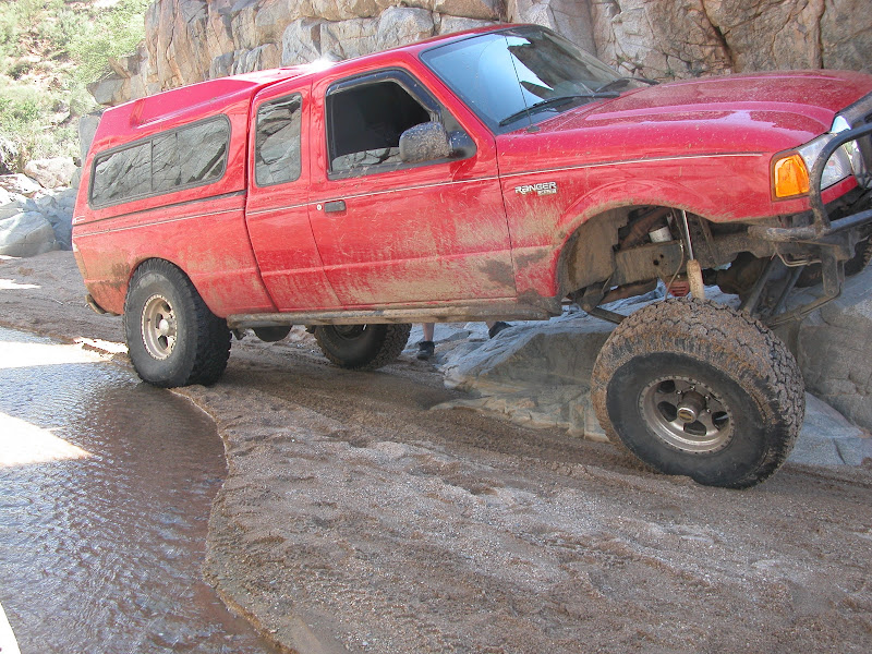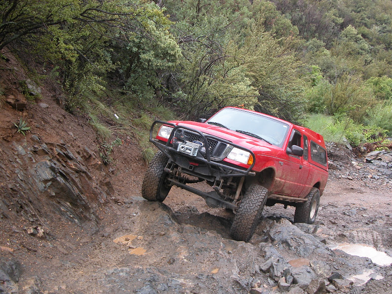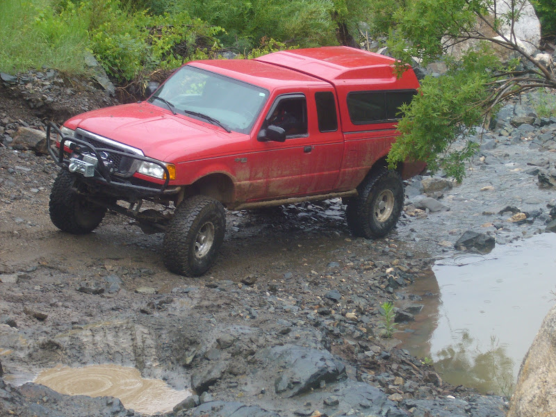 A buddy and I did a trail that is pretty fun with some fun obstacles and is about 30 miles long. My first time on this trail since the SAS. I tired all the obstacles except one. I only had to be winched once and pics don't do justice but I was just spinning. If I backed down 6" I would drop down another ledge and it was steep and tippy, but pics make it look easy. The rain is what screwed us up the most! I know my truck would have walked all over the one I skipped and the one I had to winch on. Oh well, I plan on going back the 28th!! Not many pics and hey suck because of the rain all day.