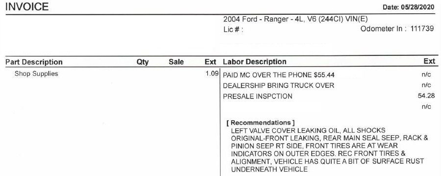 I found this 4.0L RWD 2004 Ford Ranger with 111,702 miles on it. The regular cab is the right configuration for me, and the 4.0L V6 is great and I will still be getting better gas mileage than I am now. It was a fleet vehicle which is comforting because to me that means it was taken care of more than a careless owner may have. According to the CARFAX it seems as though it was a commercial vehicle for the first three owners from 2004-2014. Cosmetically it appears to be in great shape but with no bed liner. I live 13 hours away from the dealership and so I had the dealership bring the truck in to a repair shop different than the one they recommended and had a pre-purchase inspection done.